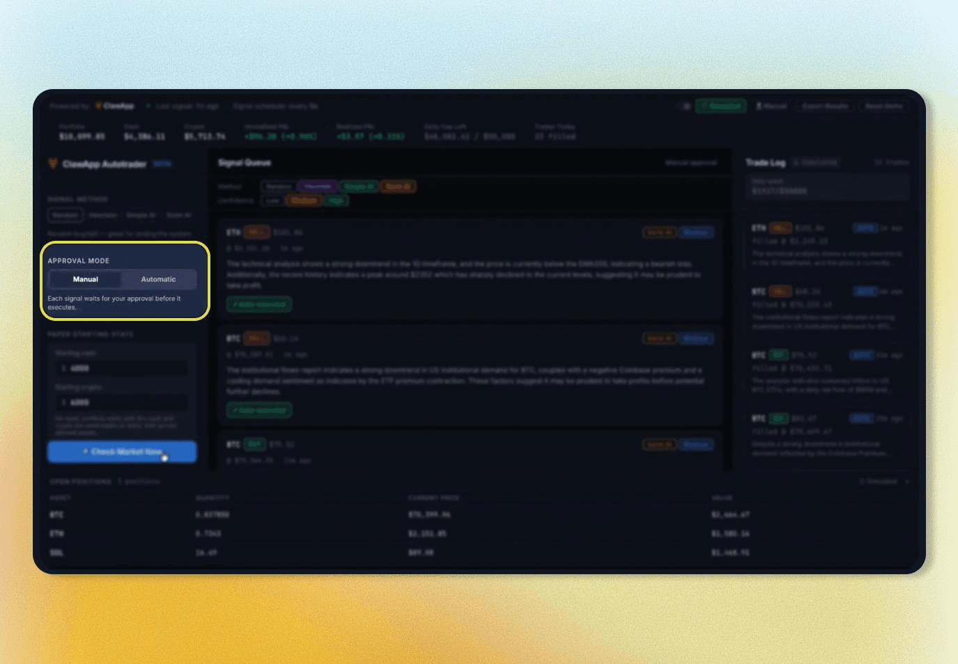 This is where ClawApp (or whichever agentic system you prefer) comes in. Load the Autotrader skill into ClawApp, set your check interval, and your agent runs continuously in the background monitoring the market, generating signals, checking them against your guardrails, and executing trades, all without a browser open or a click required. When you open the dashboard later, everything the agent did while you were away is already there. That includes every signal generated, every trade executed, every guardrail that fired and why.