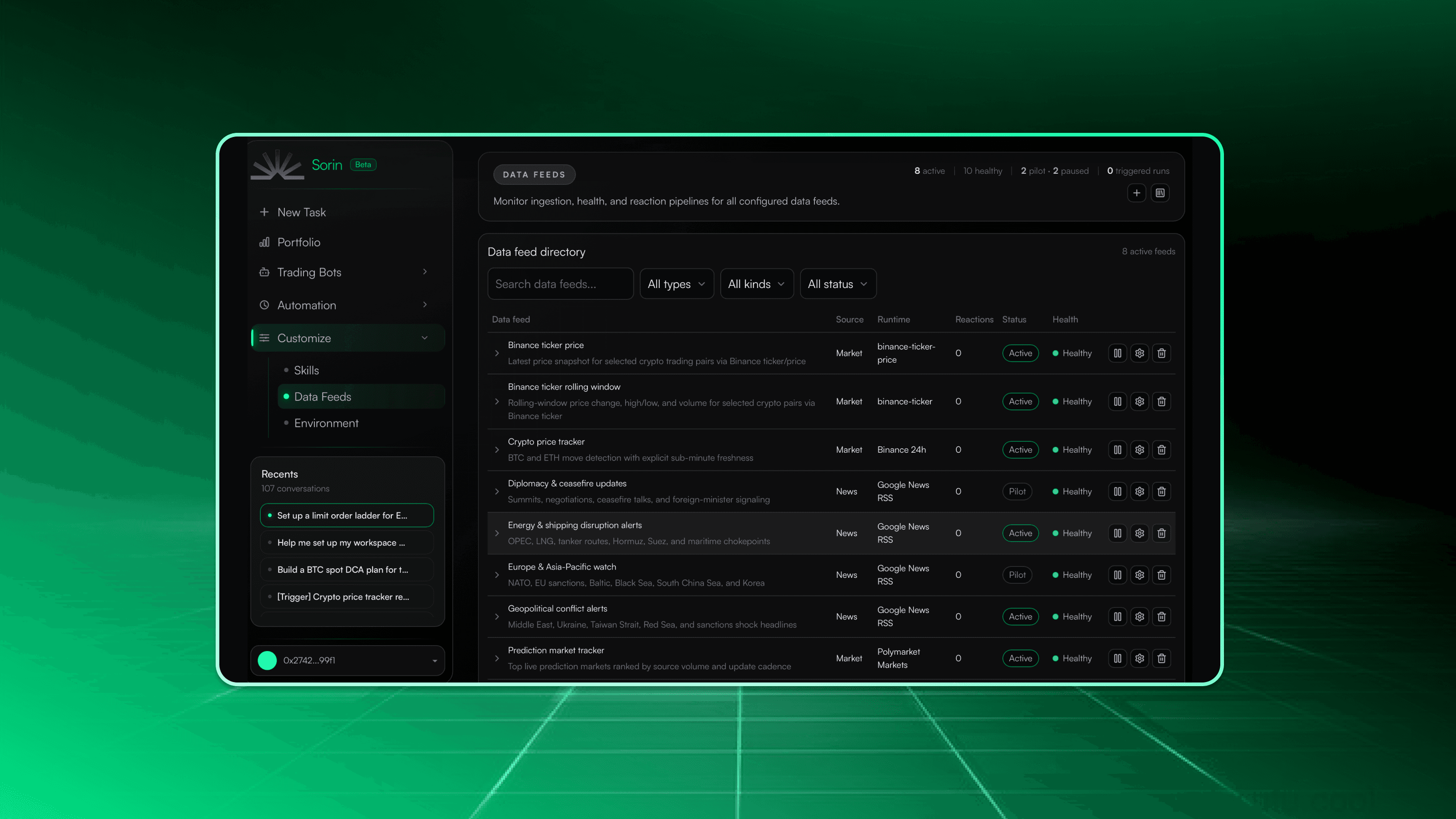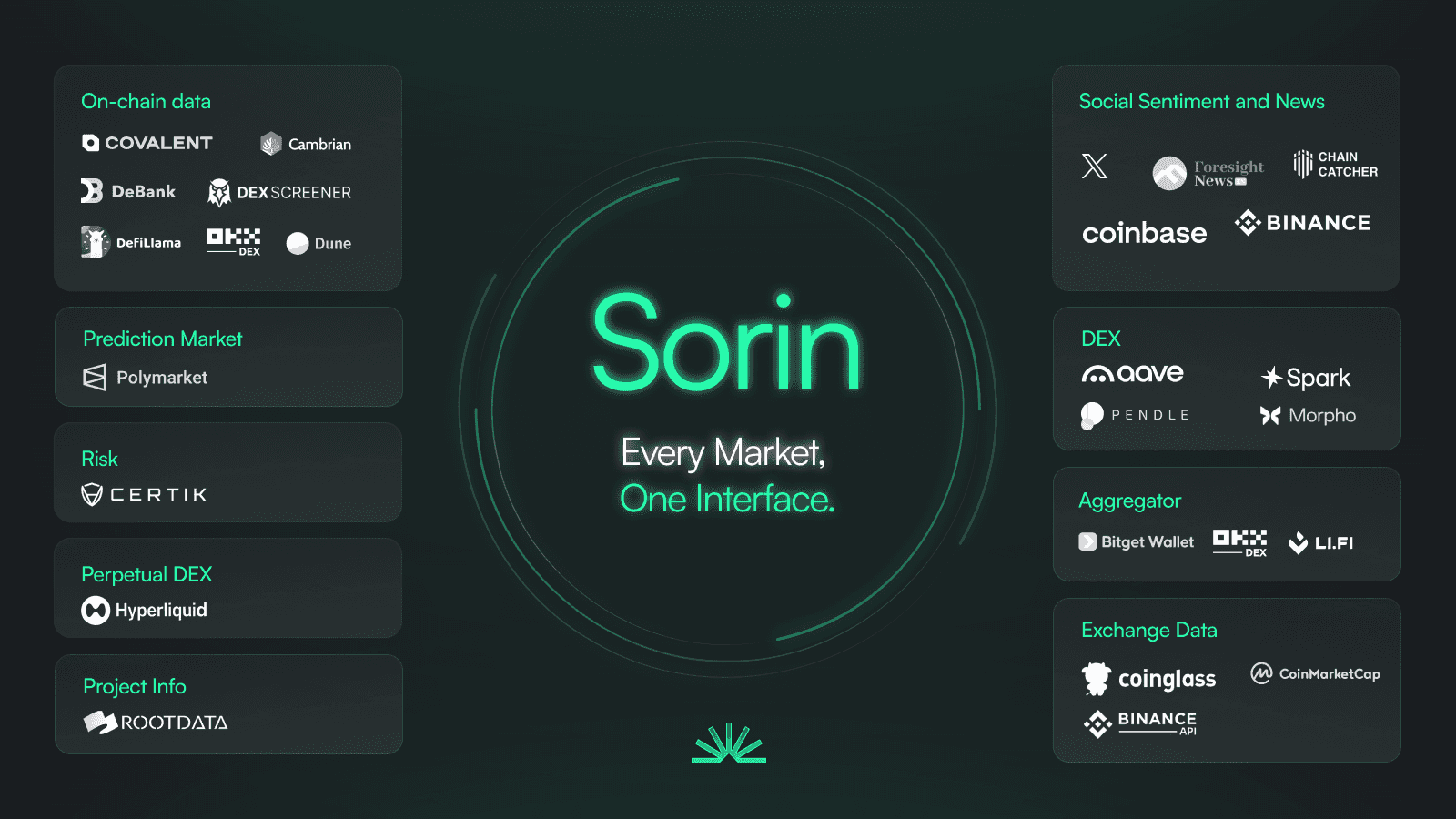 Sorin covers the full landscape: crypto, tokenized assets (stocks, metals, ETFs), prediction markets, perpetual futures, derivatives, and real-world assets. At launch, it pulls intelligence from over 20 sources across four categories: