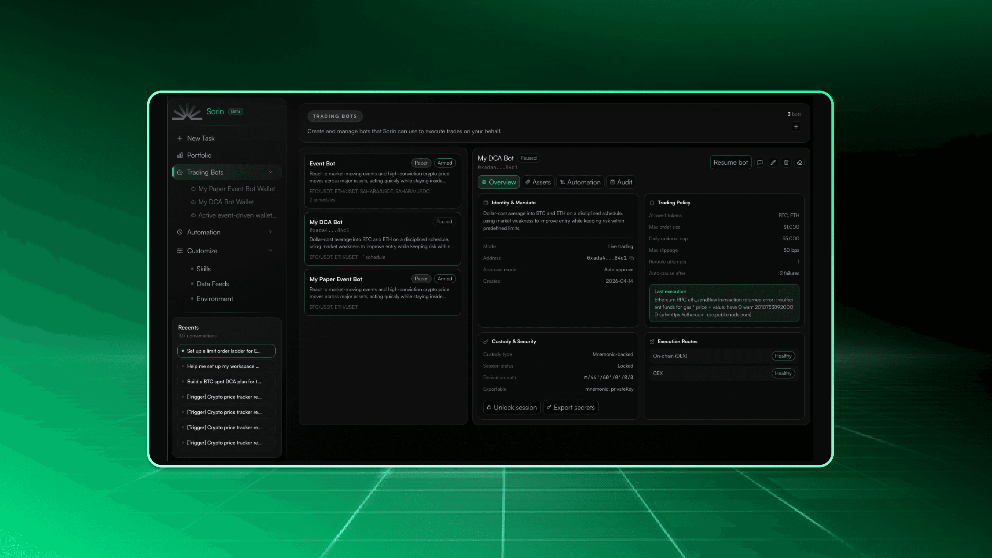 Until now, autonomous trading required either a quant team or a patchwork of bots, each locked to one platform, each requiring you to hand over funds to a wallet you don't control. Sorin puts that same capability in the hands of any individual investor: noncustodial, locally run, and connected to the exchanges and protocols you already use through your own API keys.