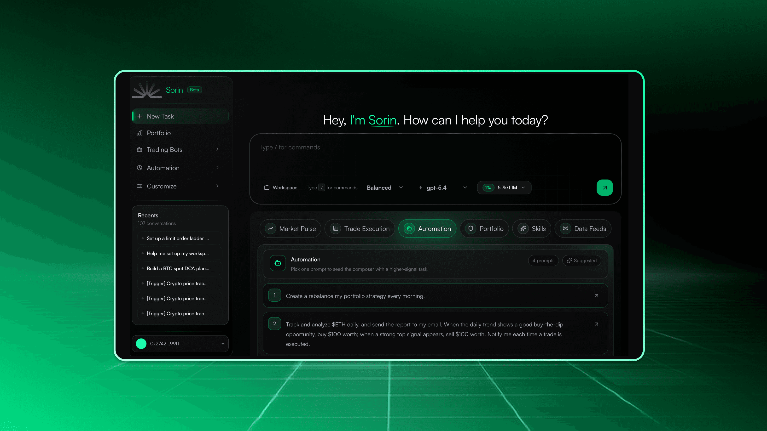 Build strategies through conversation or explicit rules. "Buy BTC if it drops below $60K, 5% of portfolio" is a valid instruction. So is a multi-step strategy with conditional logic, timing windows, and market signal triggers. Sorin also identifies inefficiencies in your approach and suggests refinements, so strategies sharpen over time.