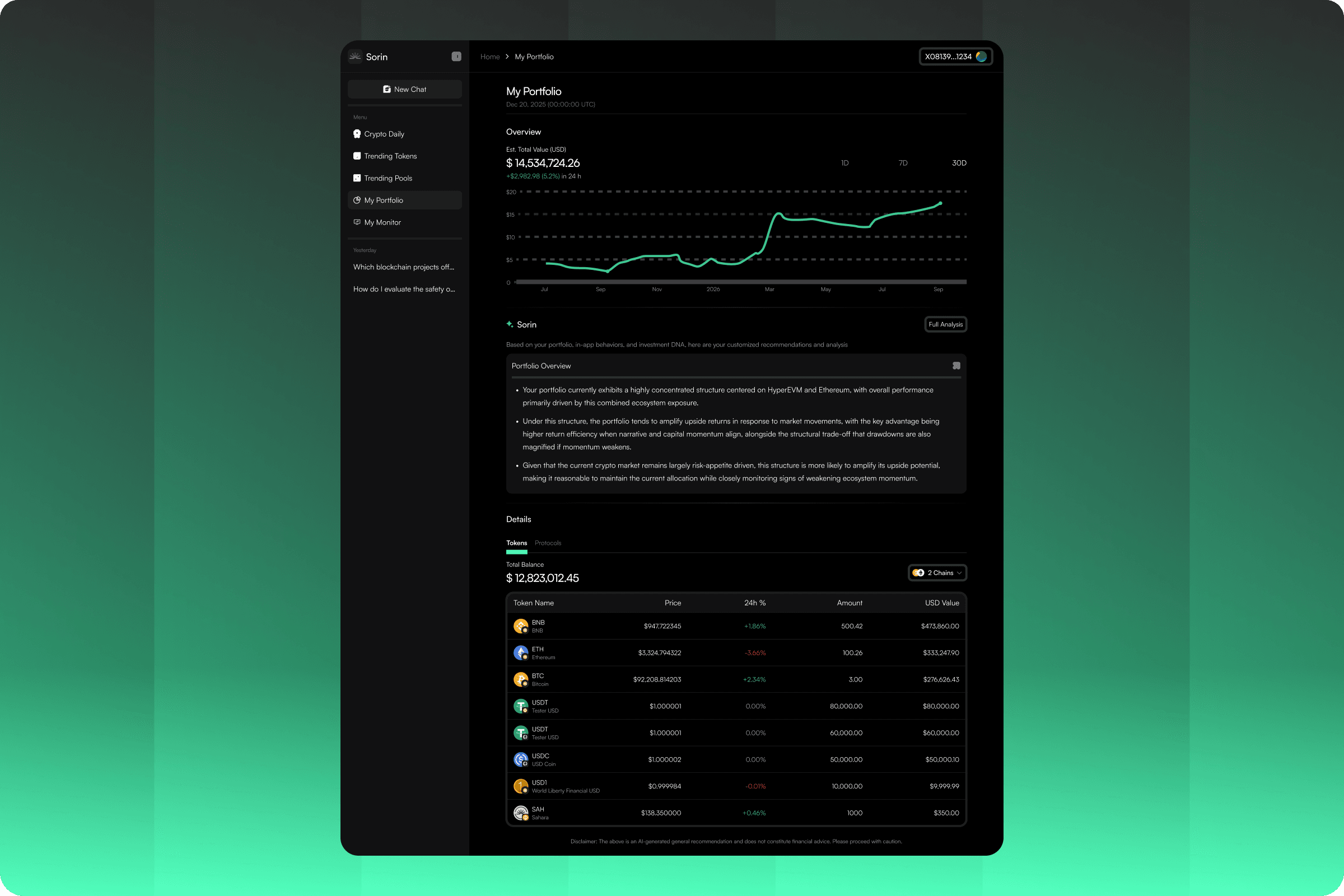 Actionable, Execution Ready Recommendations: Sorin continuously watches the markets, narratives, and assets you care about most, offering portfolio-aware insights and recommendations so you can evaluate opportunities and act without monitoring the market 24/7.