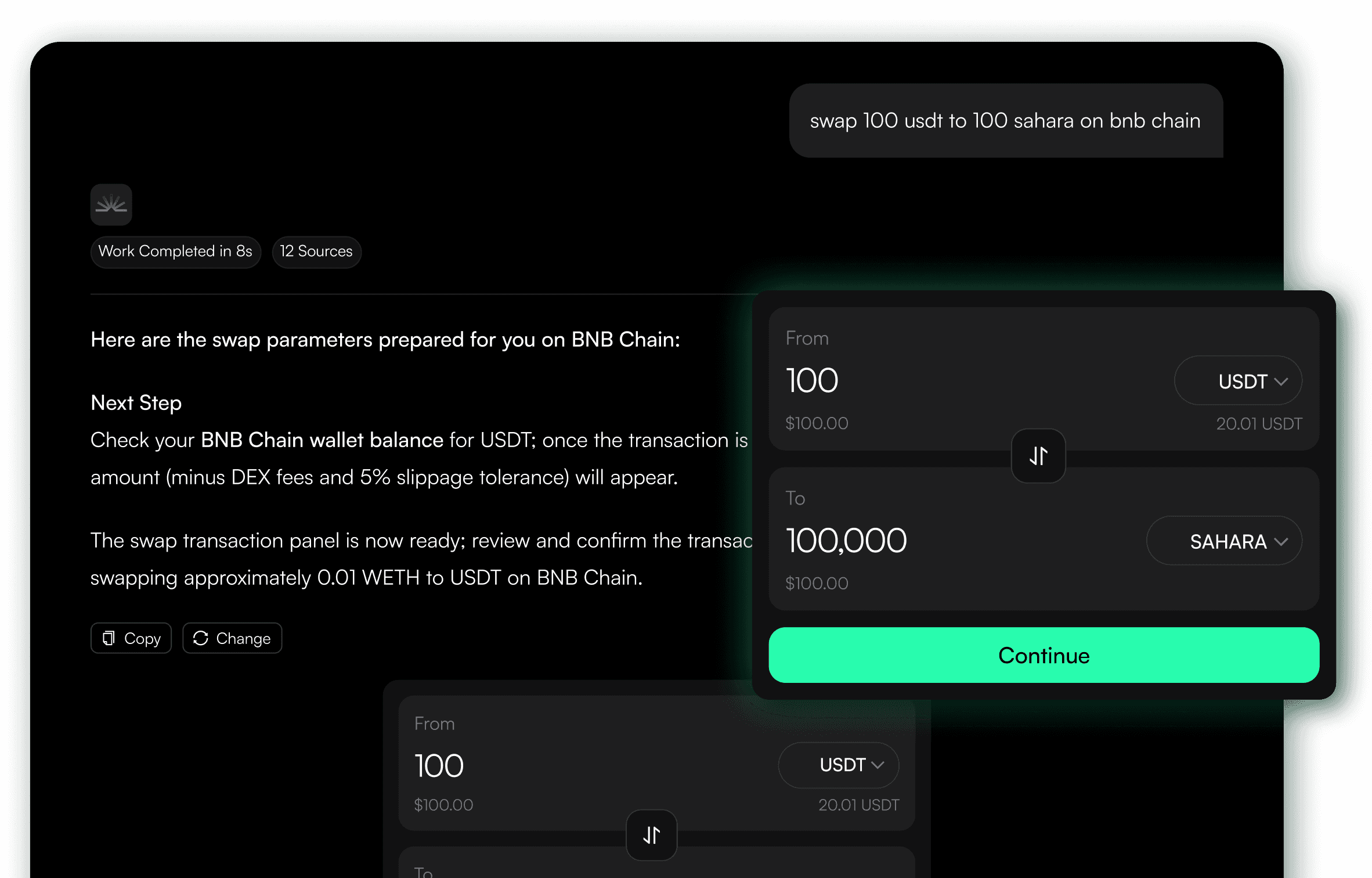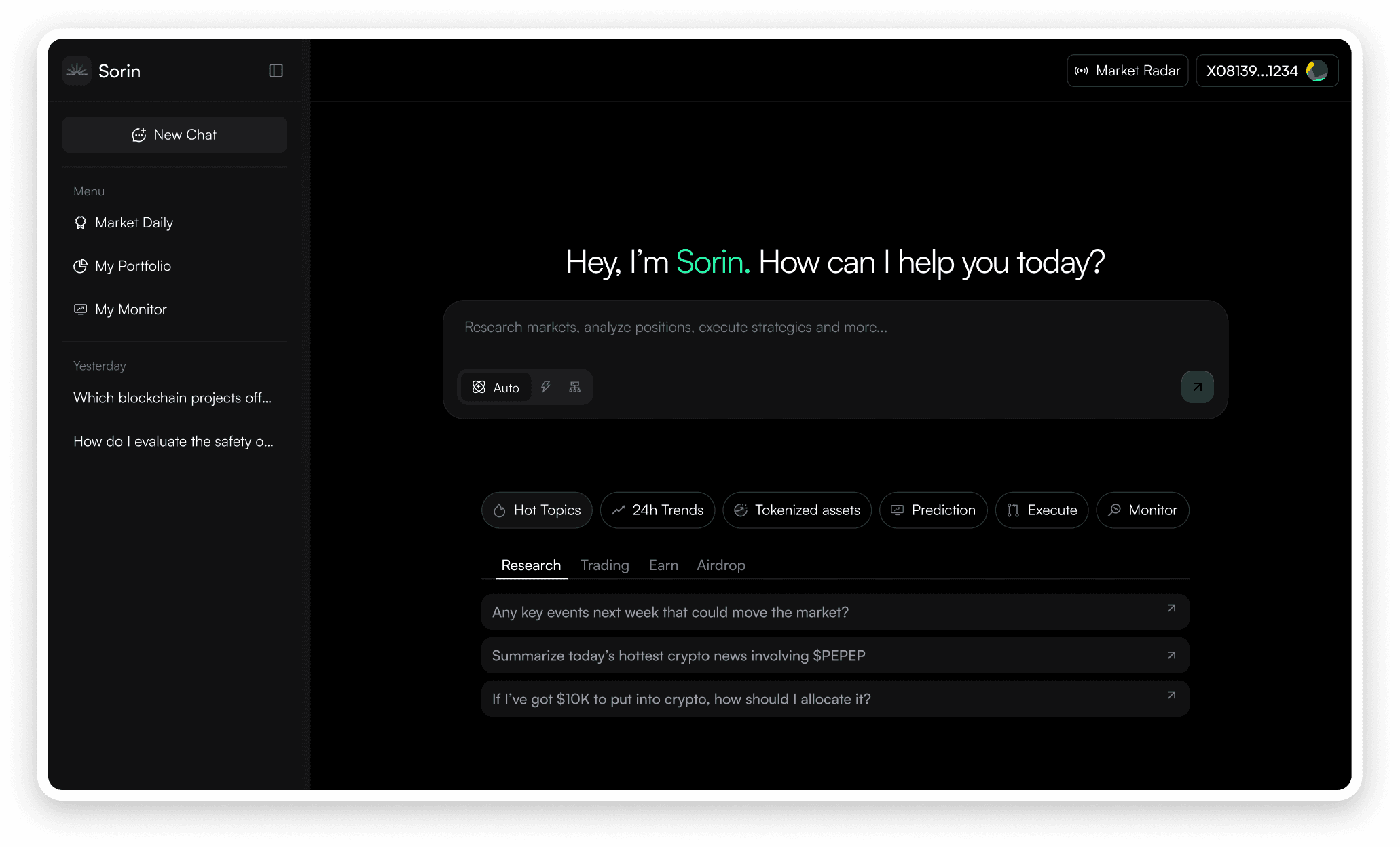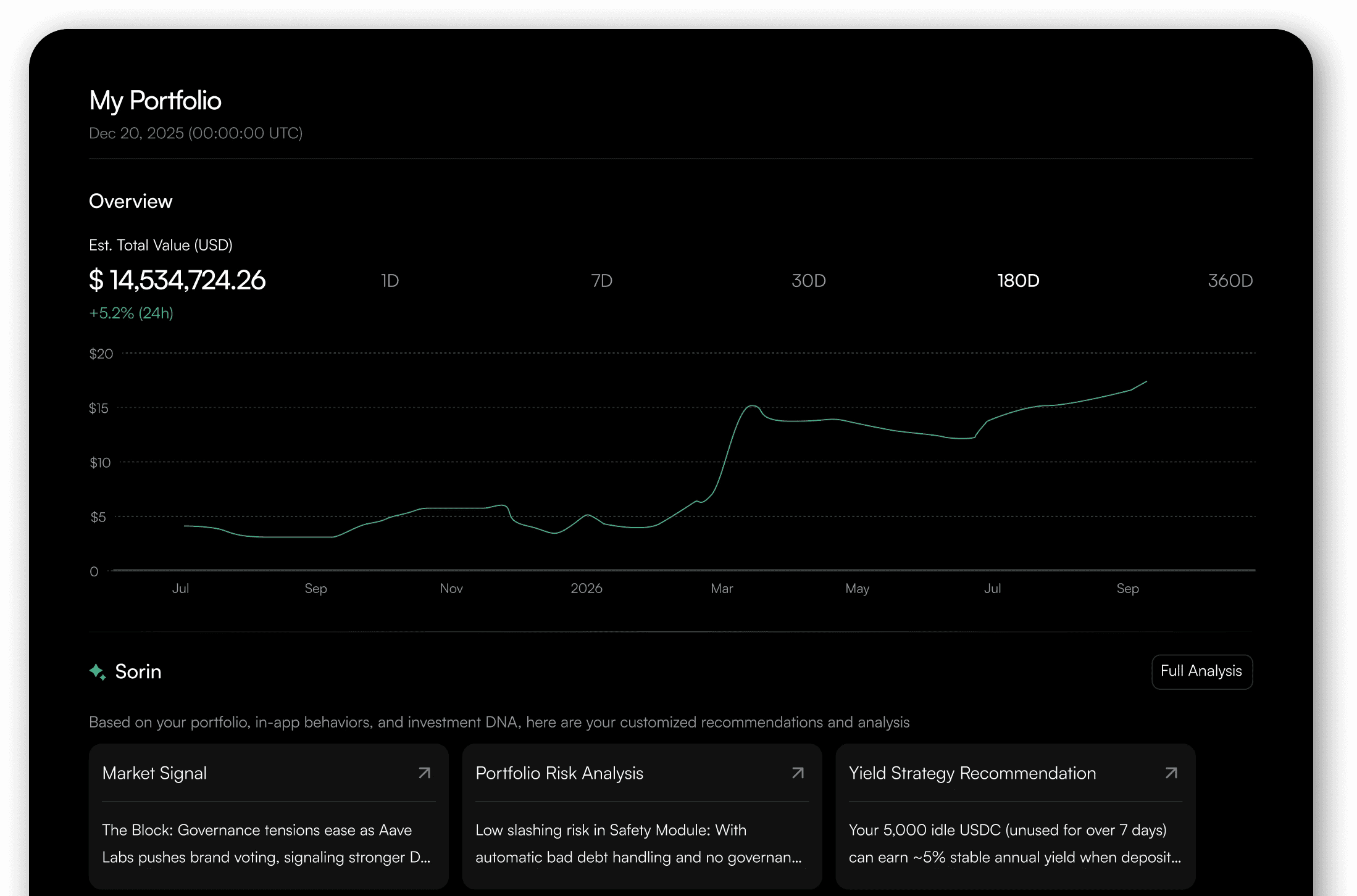 Tell Sorin what you want to do, explore options, adjust positions, and execute decisions directly in chat without switching tools.